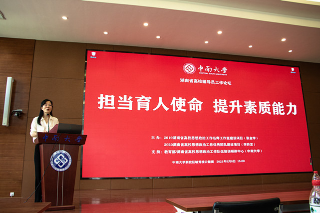 2021年5月8日下午3点,由中共湖南省委教育工委宣传部指导,高校思想政治工作队伍培训研修中心(中南大学)支持,2019湖南省高校思想政治工作名师工作室建设项目(张金学)和2020湖南省高校思想政治工作优秀团队建设项目(李玲芝)共同主办的“担当育人使命 提升素质能力”湖南省辅导员工作论坛在我校新校区毓秀楼云麓阁顺利举办。