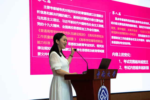 三位老师为大家介绍了辅导员素质能力大赛相关经验,他们特意强调,大赛经验来源于学生的日常教育管理工作,是辅导员九大工作职能的凝练,所以,功夫要下在平时,不要为了比赛而比赛。现场的辅导员老师们纷纷表示,三位主讲老师的分享为提升辅导员职业的核心素养提供了宝贵的借鉴经验。