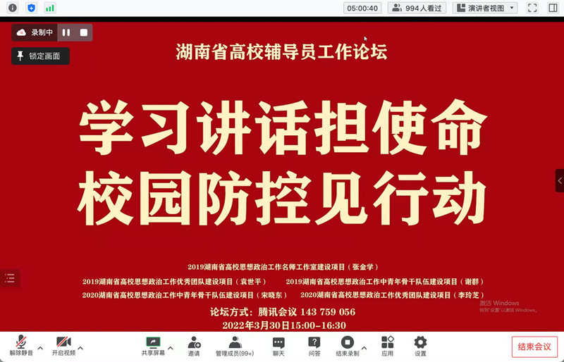 2022年3月30日下午3点,由中南大学学生工作部(处)指导,高校思想政治工作队伍培训研修中心(中南大学)支持,湖南省高校思想政治工作名师工作室、优秀团队、中青年骨干队伍等建设项目负责人张金学、袁世平、谢群、宋晓东、李玲芝牵头策划的“学习讲话担使命,校园防控见行动”高校辅导员工作论坛(线上)成功举办。