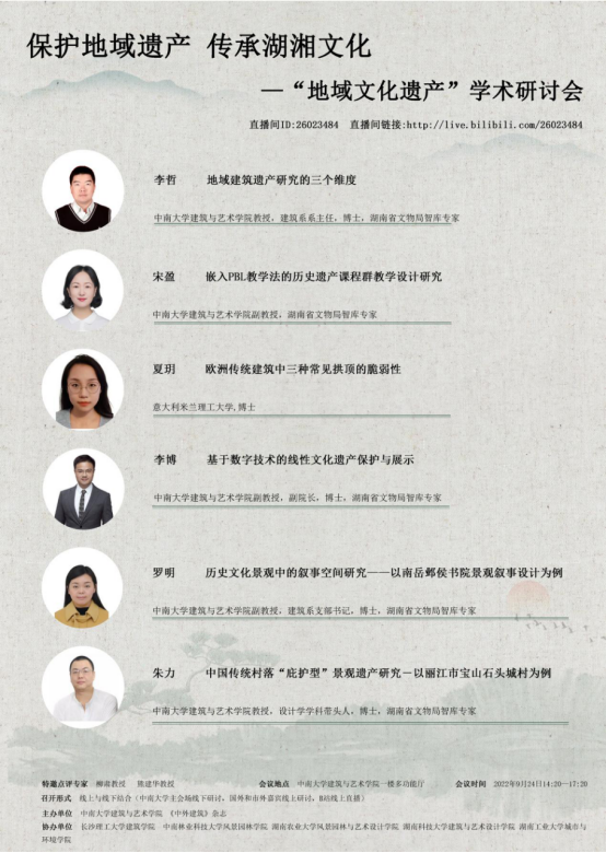 的李博、朱力、李哲、罗明、宋盈五位老师,以及意大利米兰理工大学的夏玥博士。特邀两位著名的文化遗产专家作为研讨会的点评嘉宾:一位是古建筑研究领域专家、湖南大学建筑与规划赌博app