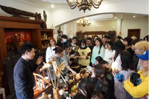 活动中,学生在老师和大学生校外创新实践基地(城市记忆公司)工作人员的带领下逐一走访了长沙绿茶制作技艺、双江锣鼓亭子、滚灯车、麻姑井糯米黄酒酿造技艺、小花片制作技艺、江背竹雕、民间剪纸技艺等长沙县非遗项目,深入了解了长沙县非遗的历史渊源、传承发展等情况,并与周长树、杨定衡、罗晴等非遗传承人展开交流,探讨非遗的创新和未来发展方向。